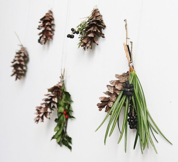 Αυτή η απλή ιδέα είναι απο το ίνδαλμά μας και θέλει μόνο κουκουνάρια, λίγη πρασινάδα, σπάγκο και χαρτοταινία. Ο λευκός τοίχος δεν είναι υποχρεωτικός.