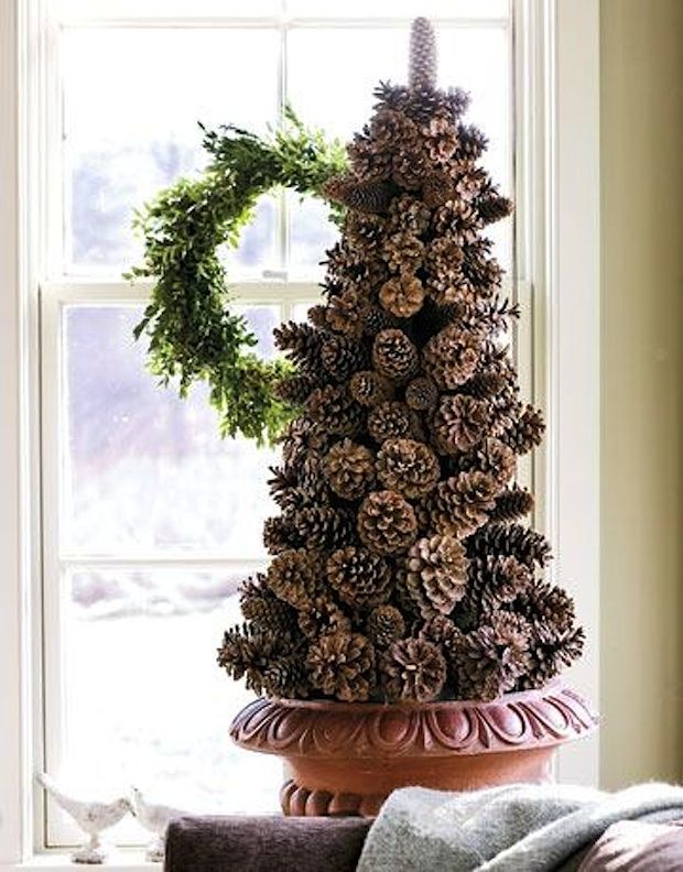 Εδώ τα κουκουνάρια έγιναν χριστουγεννιάτικο δένδρο σε μίνιμαλ εκδοχή. Μπορούν να πασπαλιστούν με γκλίτερ ή ψεύτικο χιόνι ή χρυσόσκονη, να στολιστούν με κορδελάκια ή γιρλάντες ή και μίνι φωτάκια – συμπληρώστε ανάλογα με το γούστο σας.