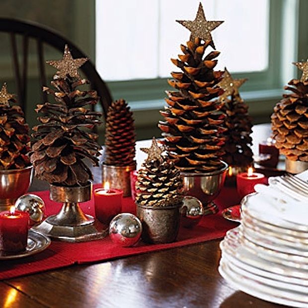 Να μιά καλή ιδέα για να αξιοποιηθούν διάφορα ξεχασμένα (και μαυρισμένα) ασημικά. Τα γεμίζουμε με κουκουνάρια, προσθέτουμε κεριά και μπάλες και τα βάζουμε πάνω σε ένα runner στο κέντρο του τραπεζιού.