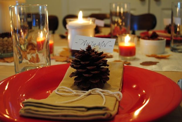 Ένα κουκουνάρι για κάθε καλεσμένο, πάνω σε μιά πετσέτα τυλιγμένη με απλό σπάγκο.Απλό, εύκολο, όμορφο και με πολλά περιθώρια αυτοσχεδιασμών.
