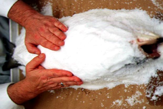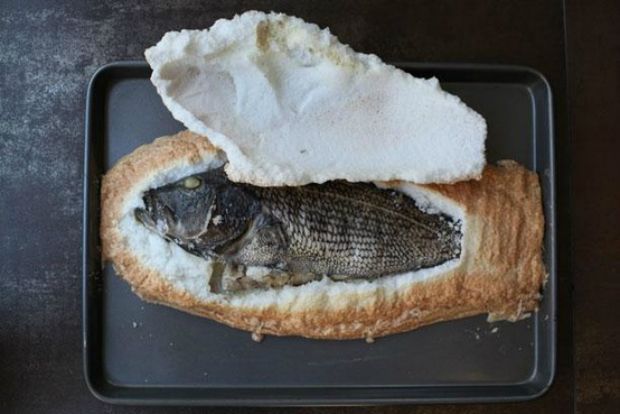 Μουσκεύουμε με λίγο νερό το χοντρό αλάτι και σ’ένα οβάλ ταψί βάζουμε μία λεπτή στρώση από αλάτι. Κατόπιν, τοποθετούμε πάνω της το ψάρι. Με το υπόλοιπο αλάτι καλύπτουμε ολόκληρο το ψάρι.