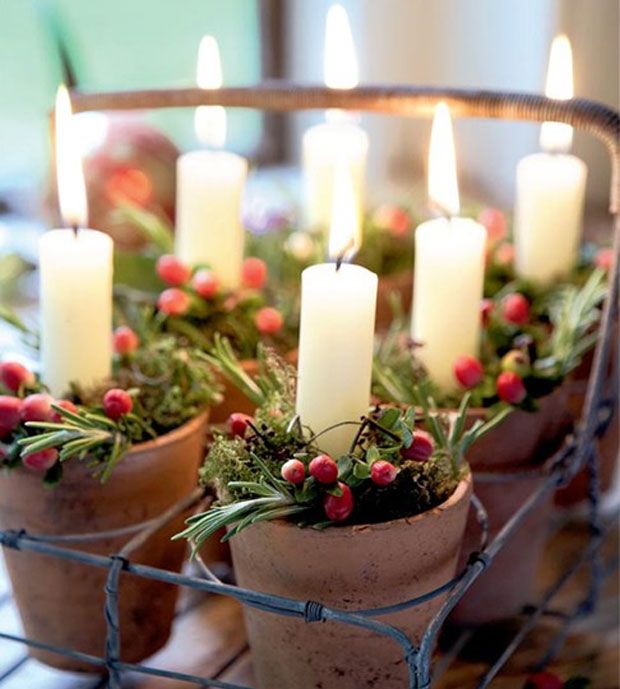 Μικρά γλαστράκια, εν σειρά για έξω: απλούστατα, πήλινα με λίγες πρασινάδες κομμένες, ίσου μεγέθους κεριά και αυτό είναι όλο.