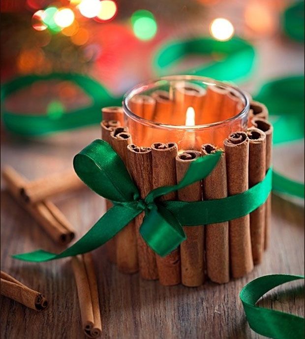 +1: αυτό κι αν μυρίζει Χριστούγεννα! ντύστε τα κεριά που ήδη εχετε με ξύλα κανέλλας και στερεώστε με μια πράσινη κορδέλα. Προσοχή στο φιογκάκι.
