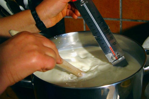 Αν χρησιμοποιείτε φρεσκοαρμεγμένο γάλα, βράστε το σε μεγάλη ανοξείδωτη κατσαρόλα με βαρύ πάτο και σε μέτρια φωτιά για 8-10 λεπτά, ανακατεύοντας συχνά και προσέχοντας να μην κολλήσει στον πάτο και καεί, γιατί η μυρωδιά καψίλας καθόλου δεν ταιριάζει στο τυρί δυστυχώς. Αφήστε το γάλα να κρυώσει λίγο και να έρθει σε θερμοκρασία περίπου 70 βαθμών Κελσίου. Χρησιμοποιήστε θερμόμετρο υγρών για να κάνετε σωστά τη δουλειά ή βάλτε το (πολύ καθαρό) δάχτυλό σας, που πρέπει να το νιώθει ζεστό μεν αλλά ανεκτό.