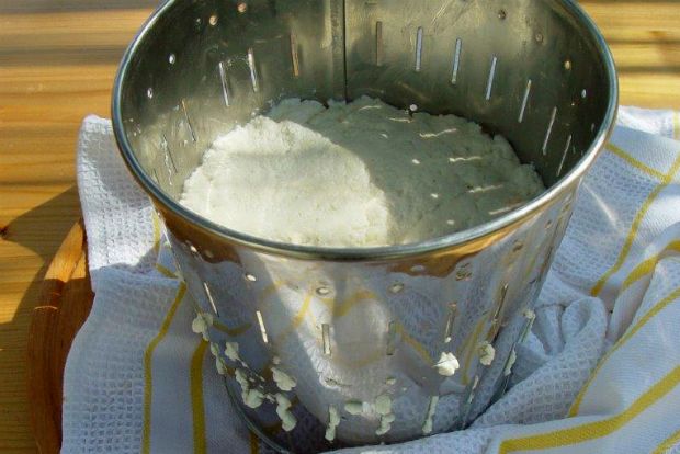 Αφού σουρώσετε όλα τα πηγμένα κομμάτια θα σας μείνει το τυρόγαλα. Μην το πετάξετε.