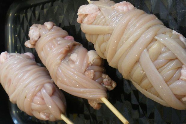 Ψιλοκόβουμε συκωταριά και τα συναφή, καθαρίζουμε καλά με καλαμάκι και πλένουμε τα έντερα ή τα προμηθευόμαστε από τον Τάκη Μέλλο, που μας τα δίνει ωραιότερα καθαρισμένα και κομμένα κι έτσι απαλλασσόμαστε από τη «βρώμικη» δουλειά.