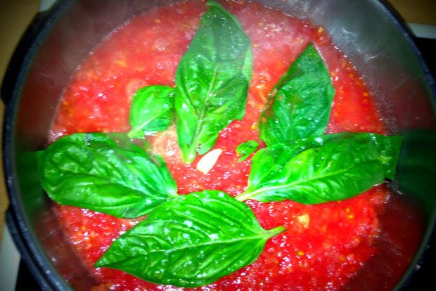 Προσθέτουμε τα φύλλα βασιλικού ολόκληρα ή ψιλοκομμένα, βάζουμε το σκόρδο, ρίχνουμε το αλάτι (είναι βασικό να αλατίσουμε από την αρχή γιατί αυτό θα βοηθήσει να βγάλει τα νερά της η ντομάτα).