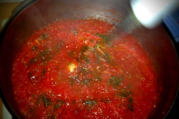 Σιγοβράζουμε με σκεπασμένο το καπάκι για ένα μισάωρο ενώ στο ενδιάμεσο έχουμε προσθέσει τη ζάχαρη (επίσης πολύ βασικό για τη γεύση της σάλτσας). Λίγο πριν κλείσουμε την εστία ρίχνουμε μισό ποτηράκι λάδι και το αφήνουμε να σιγοβράσει για ένα πεντάλεπτο ώστε να δέσει η σάλτσα.