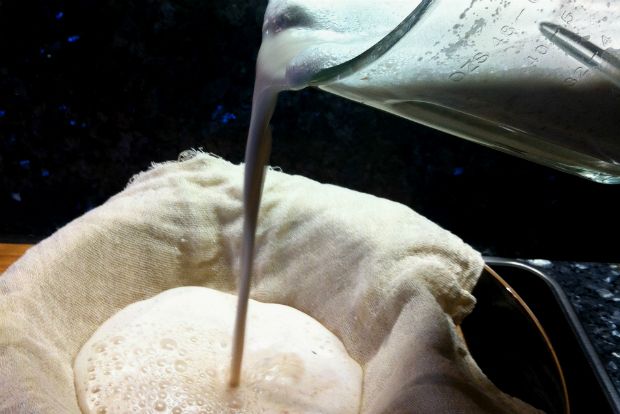 Πάνω από ένα μεγάλο μπολ βάζεις ένα σουρωτήρι το οποίο έχεις στρώσει με πολλά κομμάτια γάζα και αδειάζεις εκεί το μίγμα από το μπλέντερ. Περιμένεις 5-10 λεπτά να περάσει όσο περισσότερο υγρό γίνεται. Διπλώνεις τη γάζα για να κλείσεις τον πολτό που έχει μείνει και σφίγγεις με τα χέρια καλά για να στραγγίσεις ότι έχει μείνει. Μεταφέρεις το γάλα σε γυάλινο μπουκάλι και το φυλάς στο ψυγείο για 4 – 5 μέρες. Το μόνο που χρειάζεται κάθε φορά πριν το χρησιμοποιήσεις είναι ένα καλό κούνημα του μπουκαλιού.