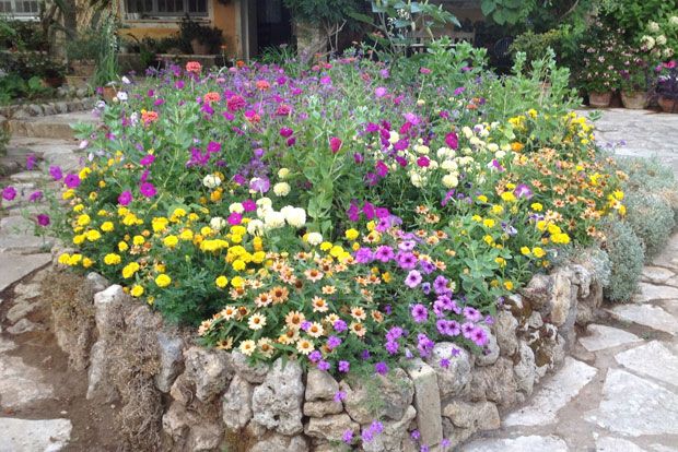 Πρώτον: Έχω, σε περίοπτο σημείο του κήπου σε πρώτο πλάνο καθώς πλησιάζεις το σπίτι, ένα υπερυψωμένο παρτέρι, μια μεγάλη γλάστρα χτιστή ας πούμε, που σκοπός του είναι να προσφέρει ιδεώδεις συνθήκες στα εποχικά. Είναι φυτεμένο με καλοκαιρινά μονοετή.
