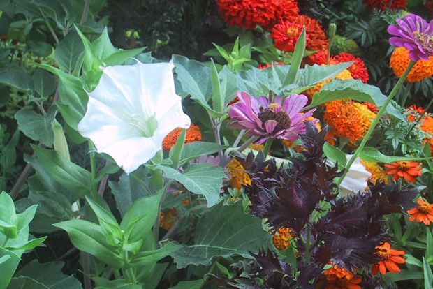 Μερικά, όπως οι ζίννιες, οι πετούνιες, οι κατιφέδες κλπ. τα σπέρνουμε το χειμώνα σε αυτοσχέδια φυτώρια στα περβάζια, και τα φυτεύουμε στις αρχές Ιουνίου στο χώμα, και άλλα, όπως η Datura metel και η Euphorbia marginata, φυτρώνουν εκεί μόνα τους από σπόρο που έπεσε το προηγούμενο καλοκαίρι.
