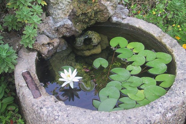 Από το παλαιό ελαιοτριβείο του κτήματος έχω και μεγάλες πέτρινες γούρνες στρατηγικά τοποθετημένες και φυτεμένες. Σε μία μάλιστα, έχω κάνει μικρή λίμνη με νούφαρα.