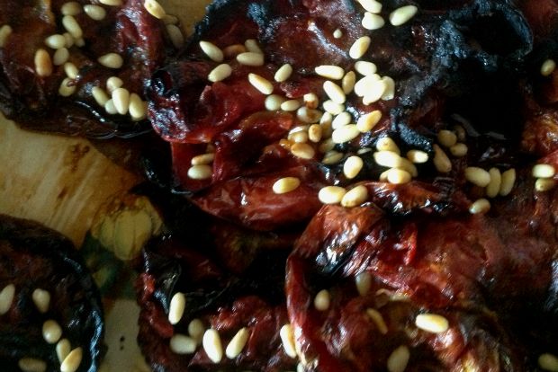 Όταν την έφτιαξα πρώτη φορά ενθουσιάστηκα αλλά και αποφάσισα ότι πήγαινε λίγο χαμένη ως κρύα σαλάτα. Η βαθιά, συμπυκνωμένη, καπνιστή, καραμελωτή ντοματίλα της άξιζε να δοκιμαστεί ζεστή από το φούρνο. Έτσι κατέληξα στην σημερινή παραλλαγή που την υψώνει σε βάθρο πρώτου ή και κύριου πιάτου. Την πρώτη φορά χρησιμοποίησα ως ζυμαρικό χυλοπιτάκια ζέας ολικής άλεσης που ταίριαξαν ιδιαίτερα και τα συστήνω, αλλά έκτοτε (και επειδή εδώ στην επαρχία δεν βρίσκουμε ζυμαρικά ζέας) έχω χρησιμοποιήσει και κανονικά σπαγγετίνι ή λιγκουίνι.