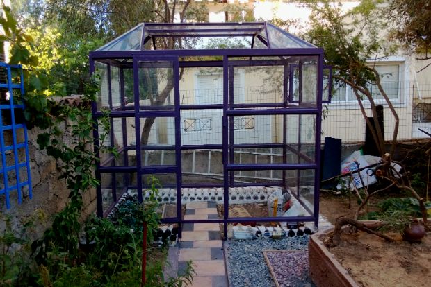 Αποφάσισα να φτιάξω θερμοκήπιο-σπορείο για ακόμη καλύτερη παραγωγή. Τα τζάμια είναι πανάκριβα αλλά οι Αθηναίοι και λοιποί συμπολίτες μου πετούν στα σκουπίδια πόρτες και παράθυρα. Αποφάσισα να τα μαζεύω όλο το καλοκαίρι και να βγάζουμε τα τζάμια μαζί με το φίλο μου το Στέλιο τον Πολωνό, έναν εξαιρετικά φιλότιμο άνθρωπο που βοηθάει πρόθυμα σε τέτοιες δουλειές με πολύ λογικά ανταλλάγματα. Τα γυαλιά που χρειαστήκαμε για να καλύψουμε το μεταλλικό σκελετό του φίλου Διονύση του Σιδερά ήταν πολλά όπως αποδείχθηκε. Όμως το καλοκαίρι ήταν μακρύ, τα ευρήματα αρκετά και τώρα μας λείπουν μόλις δυο τζάμια πλάτους 52 εκατοστών επί 130 εκατοστά γιατί ξηλώσαμε και τζάμια από μια ντουλάπα και τελειώσαμε. Τέλειωσαν όμως λες και οι πόρτες δίπλα στα σκουπίδια. Το βάψαμε πάντως και μοβ και θα στολιστεί ψυχεδελικά.