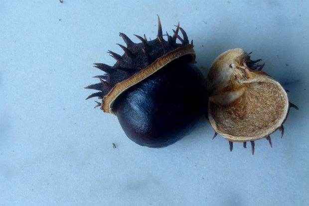 Η αγριοκαστανιά επίσης άρχισε να ρίχνει τα φύλλα και τους καρπούς της. Αυτοί δεν τρώγονται αλλά τους βρίσκω πολύ όμορφους, λείους και στιλπνούς μέσα από το αγκαθωτό τους περίβλημα. Κι αυτούς χρησιμοποιώ μέσα στο σπίτι για διακόσμηση, μαζί με πολλά από τα άγρια ρόδια, όμορφα στην όψη αλλά θεόξινα.