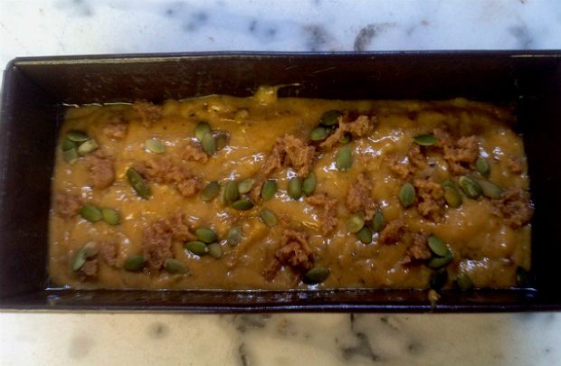 Το κέικ που ακολουθεί είναι από αμερικάνικη συνταγή. Εκεί το λένε Pumpkin Bread, παρόλο που δεν έχει σχέση με ψωμί. Είναι γλυκό και νωπό, με υφή που θυμίζει τσίζκεϊκ. Στη δική μου παραλλαγή το κέικ είναι λιγότερο γλυκό, η κολοκύθα είναι ψητή και όχι βραστή, το ελαιόλαδο αντικαθιστά το βούτυρο και περιλαμβάνονται και οι σπόροι, κάτι που δεν συνηθίζεται εκεί πέρα. (Τους αγοράζω έτοιμους ξεφλουδισμένους από μαγαζί ξηρών καρπών. Αυτούς που περιέχει ή κολοκύθα τους ψήνω και τους τρώμε πασατέμπο.)