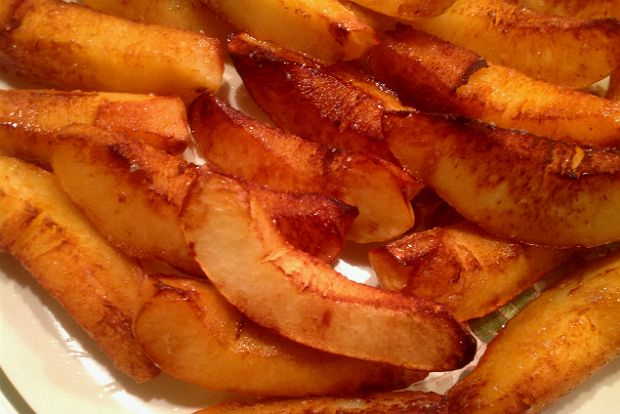 Πασπαλίζουμε τις φέτες κυδωνιού με τη ζάχαρη και τις τσιγαρίζουμε στο λάδι σε ρηχή κατσαρόλα γυρίζοντάς τις με τσιμπίδα ώσπου να ροδίσουν και να καραμελώσουν απ όλες τις μεριές (7-8 λεπτά). Τις βγάζουμε και αφήνουμε να στραγγίσουν σε χαρτί κουζίνας.