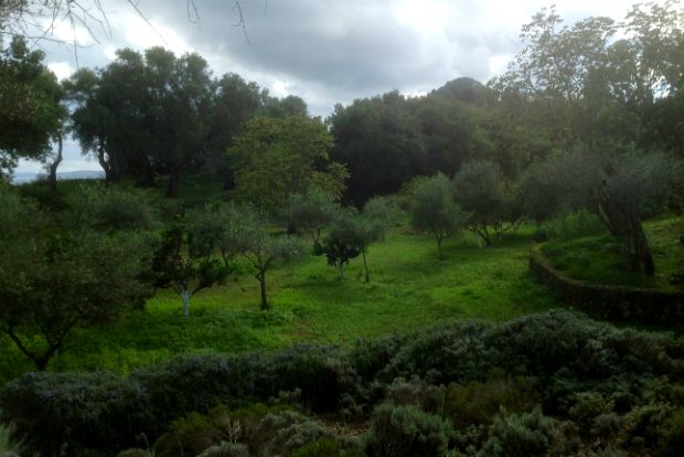 Η χρωματική ιδιαιτερότητα του κήπου και του γύρω τοπίου τέτοια εποχή, η ομορφιά του, δεν είναι η πολυχρωμία αλλά οι αποχρώσεις του πράσινου. Ο τόσο χαρακτηριστικός για την Κέρκυρα συνδυασμός ελιάς και κυπαρισσιού με τον φωτισμό του Δεκεμβρίου βρίσκει τον καλύτερο εαυτό του.