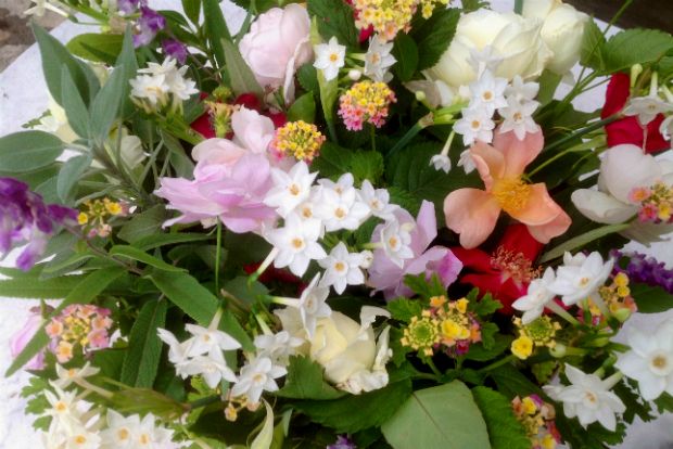 Υπάρχουν ακόμα μερικά χρώματα εδώ κι εκεί, κυρίως από τις «παλιές» τριανταφυλλιές, ιδίως την πιο παλιά από όλες, τη μονή Rosa chinensis, την βυσσινιά και την mutabilis, που πολλές χρονιές ανθίζουν όλο τον χειμώνα. Αυτά και τις αφόρητα πολύανθες λαντάνες, που βαριέμαι να τις βλέπω, μαζεύω και φτιάχνω ένα Δεκεμβριανό καλάθι για μέσα στο σπίτι, όπου το σκοτάδι της συννεφιασμένης μέρας απαιτεί λίγη λάμψη.