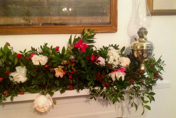 Το επόμενο ήταν με λουλούδια: τα τελευταία τριαντάφυλλα – άσπρα κόκκινα και ροζ – και τους νάρκισσους, που τώρα γεμίζουν τον τόπο, τους ανθούς λεμονιάς και μανταρινιάς. Για αντίθεση: κόκκινα και πορτοκαλιά ροδόμηλα από τις τριανταφυλλιές που έχουν πάψει να ανθίζουν. Ως βάση αυτή τη φορά χρησιμοποίησα το σκίνο με τους κόκκινους καρπούς του και τη βελανιδιά, που τα φύλλα τους μοιάζουν με το κλασσικό ου των Χριστουγέννων. Έχω βάλει πολλά τριαντάφυλλα, γιατί τυχαίνει να τα έχω, αλλά και πολύ λιγότερα, στρατηγικά τοποθετημένα, θα κάνουν το ίδιο εφέ.