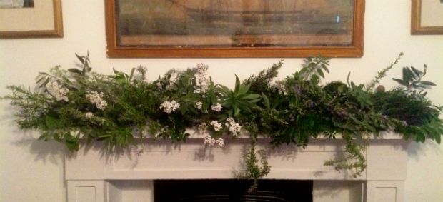 Με γκρίζα και ασημιά φυλλώματα γίνεται το «μεσογειακό» θέμα… που τυχαίνει και πολύ μυριστικό με κλαδάκια από διάφορα δεντρολίβανα και φασκομηλιές, λεβάντες και θυμάρια. Βάση είναι κλαδιά ελιάς και κυπαρισσιού και καρποί της δάφνης, της μυρτιάς και του βιμπούρνου με το βαθύ σκοτεινό μπλε τους.