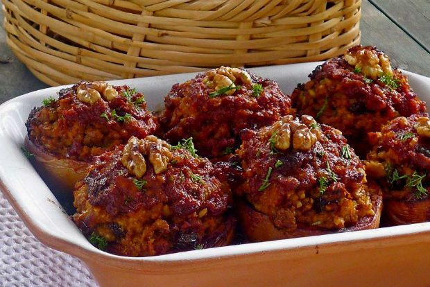 Κυδώνια γεμιστά με λουκάνικο, κιμά, σταφίδες και κουκουνάρι