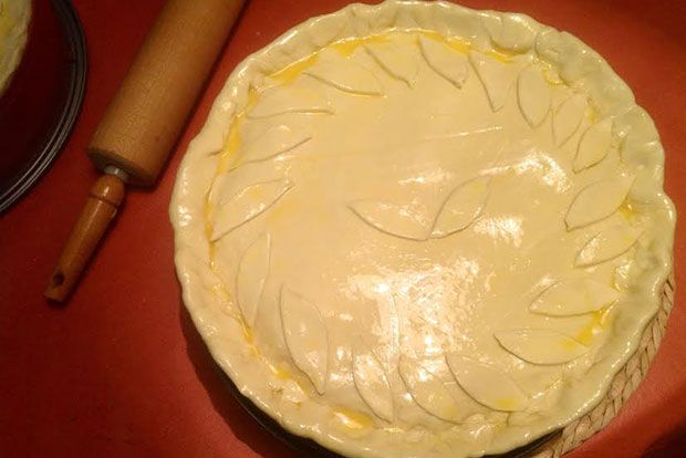 Γεμίζουμε τις δύο φόρμες με το μίγμα του παστίτσιου, ομοιόμορφα αλλά αφράτα, χωρίς να πιέζουμε. Με τα δύο τελευταία κομμάτια κάνουμε τα στρογγυλά καπάκια, διπλώνοντας καλά γύρω – γύρω για να σφραγίσει δαντελωτά. Αν μας περισσεύει ζύμη, μπορούμε να κόψουμε διακοσμητικά σχήματα όπως φύλλα ή καρδιές. Αλείφουμε με το γλάσο αυγού μ’ ένα πινέλο.