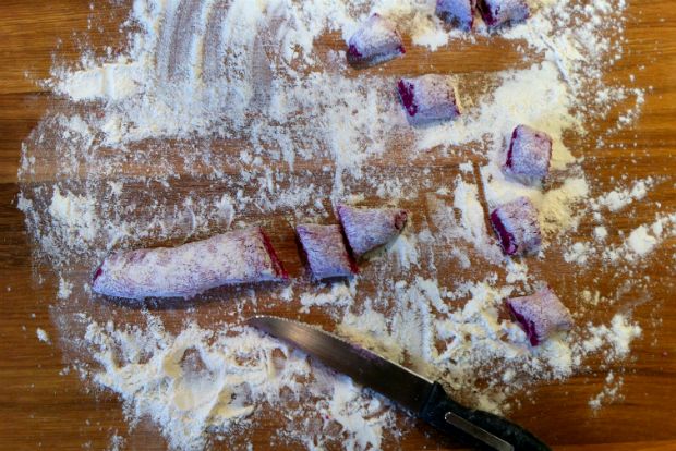 Στο τέλος ζυμώνω για λίγο μέχρι να έχω μια μαλακή ζύμη που ανεπαίσθητα σχεδόν θα κολλάει. Λόγω της υγρασίας του παντζαριού μπορεί να χρειαστεί λίγο περισσότερο αλεύρι, προσθέστε το όμως προσοχή γιατί το πολύ αλεύρι θα είναι η καταστροφή των νιόκι.