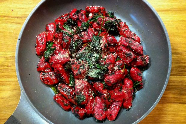 Κόκκινα νιόκι με σάλτσα από παντζαρόφυλλα