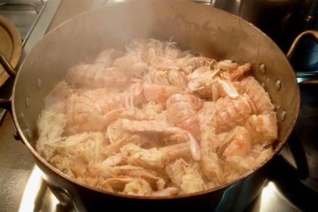 Εν τω μεταξύ καθαρίζουμε τις κανιόκιες, προσέχοντας να μη πάει χαμένη ούτε σταγόνα ζουμάκι, και βάζουμε χώρια την ψίχα (είναι λίγη και διαλύεται στο χέρι μας, αλλά δεν πειράζει καθόλου). Τα κελύφη τα σπάμε κοπανώντας με το βαρύ εργαλείο που χτυπάμε το κρέας για να λεπτύνει. Ιδίως τα κεφάλια πρέπει να σπάσουν καλά. Μετά τα βάζουμε σε αρκετά δυνατή φωτιά, σε ρηχή κατσαρόλα με βαρύ πάτο, με λίγο λάδι, και τα τσιγαρίζουμε καλά (για 10 περίπου λεπτά) ανακατεύοντας συνεχώς και προσθέτοντας κάθε τόσο 1-2 κουταλιές ζωμό ξεκολλώντας τα καραμελωμένα κομματάκια απ’ τον πάτο. Όταν έχουν τσιγαριστεί προσθέτουμε και τον υπόλοιπο ζωμό, χαμηλώνουμε τη φωτιά και σιγοβράζουμε σκεπασμένα για μισή ώρα.