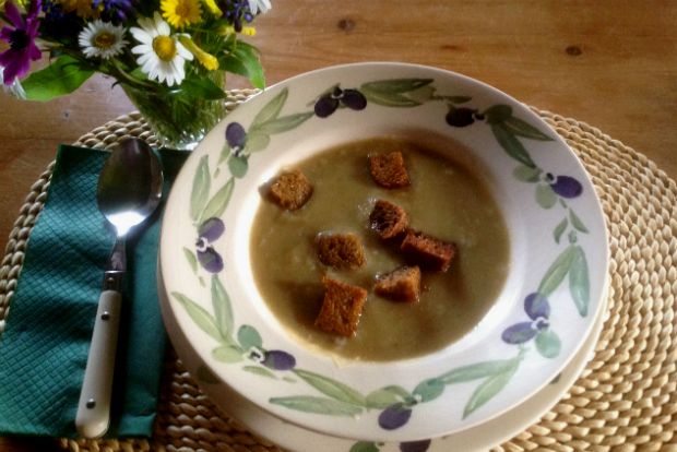 Όσο βράζουν, τσιγαρίζουμε σε λίγο λάδι τα λαχανικά. Όταν γίνει ο ζωμός, τον σουρώνουμε καλά (με τουλπάνι στο σουρωτήρι) και τον επιστρέφουμε στην κατσαρόλα. Προσθέτουμε τα λαχανικά με το λάδι τους και σιγοβράζουμε για 20 περίπου λεπτά, ώσπου να μαλακώσουν. Μέσα στην κατσαρόλα τα αλέθουμε με το μαγικό ραβδί πολύ καλά ώσπου η υφή να είναι ιδιαίτερα κρεμώδης. Σ’ αυτό το σημείο μπορούμε να προσθέσουμε την κρέμα γάλακτος (μισό φλιτζάνι), αν την θέλουμε, ή 1-2 κουταλιές ωμό λάδι. Δοκιμάζουμε για αλάτι και βάζουμε όσο χρειάζεται. Το πιπέρι θα το αλέσει στο πιάτο του κατευθείαν κάθε καλεσμένος.