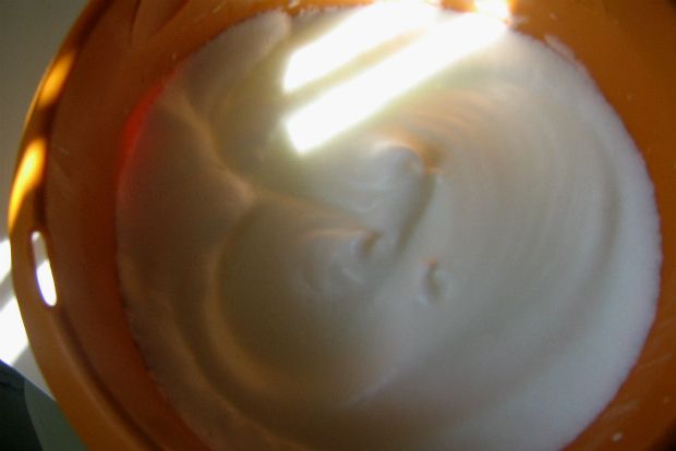 Σε άλλο μπολ χτυπάμε τα ασπράδια μέχρι να γίνουν μαρέγκα.