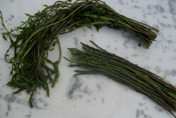 Εδώ θα κάνω μιαν εξομολόγηση: βρίσκω και τα δύο αυτά χόρτα αμετάκλητα πικρά, πράγμα που πήρα απόφαση μόνο πολύ τελευταία. Άργησα να το καταλάβω, θα μου πείτε… Δεν εννοώ βέβαια ότι δεν είχα προσέξει την πικρίλα τους, που στο κάτω – κάτω είναι έντονη και χαρακτηριστική, απλώς ότι, επειδή μου αρέσει πολύ η ιδιαιτερότητα, αυτή η ευωδιαστή χορταρίλα, του σπαραγγιού και της οβριάς, επέμενα να ελπίζω ότι θα βρω κάποιον τρόπο να ελαττώσω την πικρίλα ή να την καλύψω κατά τρόπο που δεν κουκουλώνει τελείως τη γεύση.