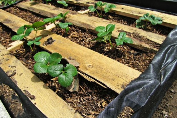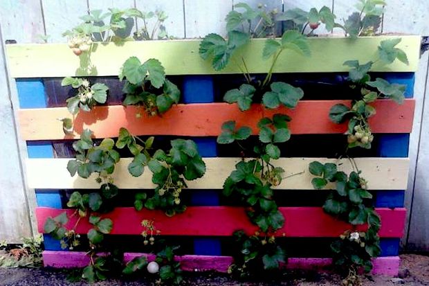Αποτελεσματική φαίνεται και η λύση της οριζόντιας, ξύλινης παλέτας. Τα φυτά αναπτύσσονται ανάμεσα στα κενά και οι φράουλες ακουμπούν με ασφάλεια πάνω στο ξύλο.