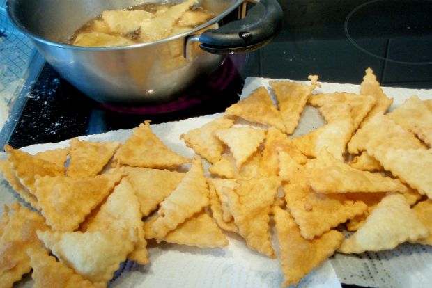 Σε αλευρωμένη επιφάνεια ανοίγουμε φύλλο – στο πάχος του τάληρου έγραφε η θεία μου η Νόρα, εγώ γράφω στο πάχος του ενός ευρώ -, το κόβουμε σε τριγωνάκια και τηγανίζουμε τα κομμάτια σε καυτό ελαιόλαδο.