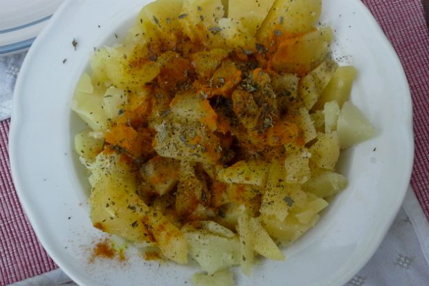 Πρόταση σερβιρίσματος: συνοδεύουμε με πατατοσαλάτα που έχουμε βράσει ταυτόχρονα με το υπόλοιπο μαγείρεμα και ντοματοσαλάτα με άφθονη τρέβλα.