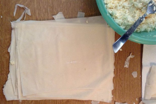 Ξεπαγώνει το φύλλο αποβραδίς – η ετοιμότητα είναι το παν – και μόλις ακούσει τη μαγική φράση («γιαγιά, θα κάνουμε τυροπιτάκια;») ξεκινάει με τη γέμιση: σε μπολ ρίχνει το τυρί, τριμμένο με το χέρι σε χοντρά κομμάτια, και σ’ ένα βαθύ πιάτο χτυπά τα αυγά για λίγο, σαν για ομελέτα. Τα αδειάζει στο μπολ με το τυρί, εκεί μπαίνει και το μοσχοκάρυδο* και ξεκινάει το ανακάτεμα μέχρι να ενωθούν τα υλικά. Αν τα υγρά υπερτερούν, προσθέτει τυρί, αν σφίγγει το πράγμα, ένα αυγό ακόμα φέρνει την ισορροπία.