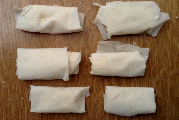 Κόβει τα φύλλα στα τέσσερα (όπως στη φωτογραφία), βάζει μισή κουταλιά της σούπας γέμιση στο κάτω μέρος και ξεκινά το τύλιγμα, πρώτα σχηματίζοντας κύλινδρο και στη συνέχεια κλείνοντας σαν φακελάκι τα κομμάτια που περισσεύουν.