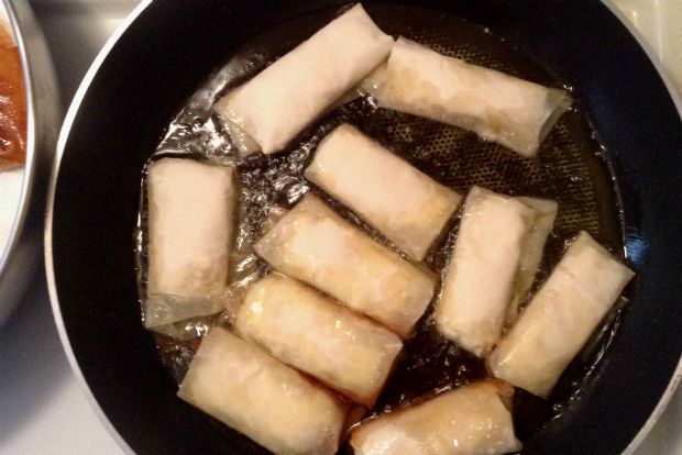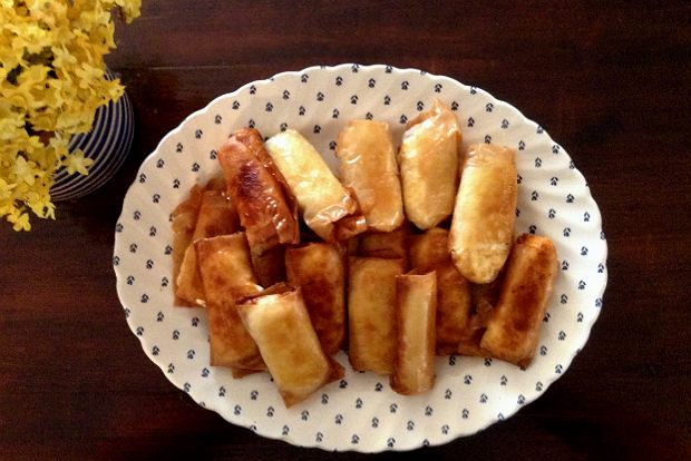 Ζεσταίνει στο μεταξύ το λάδι – περίπου δύο δάχτυλα – στο τηγάνι, σε μέτρια φωτιά και μόλις ζεσταθεί για τα καλά τα ρίχνει μέσα από τη μια πλευρά ώσπου να ροδίσουν και γρήγορα τουμπάρισμα με πηρούνι από την άλλη. Δύο με τρία λεπτά για κάθε τηγανιά φτάνουν. Συνεχίζει με τον ίδιο τρόπο, απομακρύνει κομμάτια φύλλου που κάθε τόσο μένουν στο τηγάνι και καίγονται, ενώ προσθέτει λάδι όταν χρειαστεί (συνήθως μετά τις πρώτες τρεις παρτίδες).