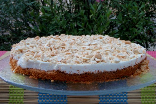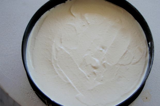 Αναμειγνύουμε στο μούλτι τα υλικά της κρέμας και τα στρώνουμε πάνω στη βάση αφού έχει κρυώσει. Σ’ αυτή τη φάση, καλό είναι να βάλουμε το ταψί στο ψυγείο για 4 – 5 ώρες πριν σερβίρουμε. Εγώ συνήθως το κάνω από την προηγούμενη και έτσι το αφήνω όλο το βράδυ στο ψυγείο. Έτσι κόβονται καλύτερα τα κομμάτια.