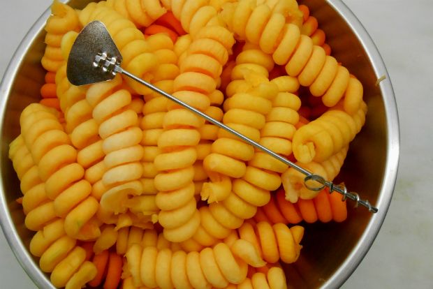 2) Θα χρειαστεί να έχετε το κατάλληλο εργαλείο για την αρίδα. Είναι αυτό που βλέπετε πάνω στα σπειροειδή κομμάτια του κολοκυθιού και το βρίσκετε εύκολα στην αγορά (σε ειδικά μαγαζιά με είδη κουζίνας ή στα μεγάλα σούπερ μάρκετ).
