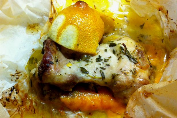 Λεονί Σταφυλά στα καλύτερά της: παίρνει τρυφερό φιλέτο από μπούτι, το τυλίγει σε πακέτο λαδόκολλας με μυρωδικά και τυρί, το φουρνίζει τυλιγμένο καλά και λίγη ώρα μετά ο φούρνος της φέρνει το πιο ζουμερό πεσκέσι. Ούτε λάδια, ούτε λεκέδες, δουλειές καθαρές και, προπάντων, νόστιμες.