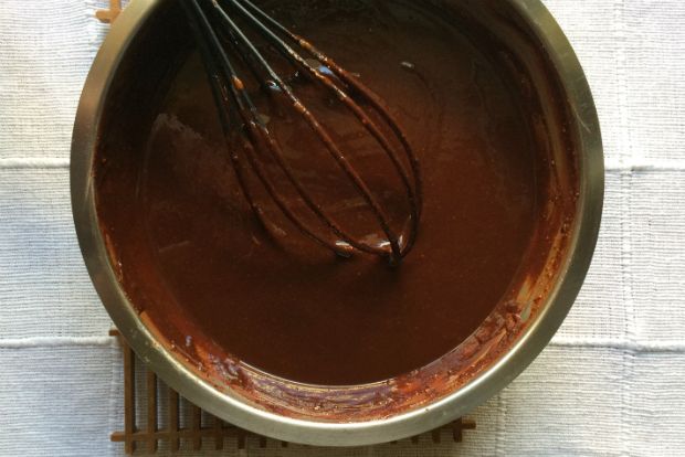 Ετοίμασα μπεν μαρί: ζέστανα νερό, μέχρι να βράσει, σε χαμηλή κατσαρόλα και πάνω της τοποθέτησα ένα μεταλλικό μπολ που ταιριάζει στο άνοιγμά της. Έλιωσα τη σοκολάτα ανακατεύοντας και, όσο ακόμα το νερό κόχλαζε, άδειασα εκεί το βούτυρο κομμένο σε κομμάτια και την κρέμα γάλακτος. Ένα πρόθυμο χέρι βοήθησε ανακατεύοντας όσο τα υλικά έπεφταν στη λιωμένη σοκολάτα.
