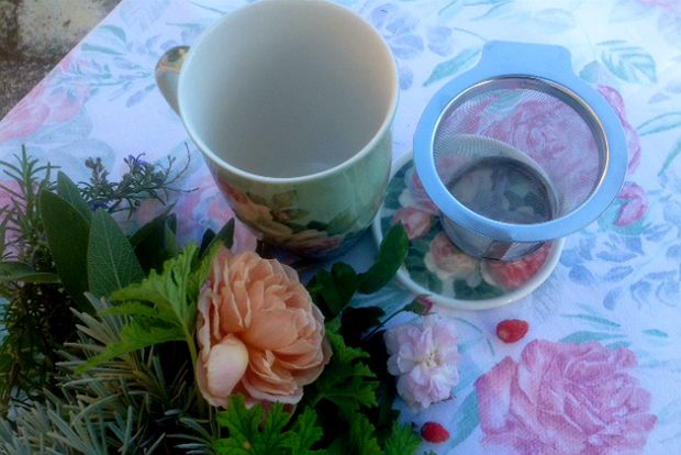 Τα σκεφτόμουνα όλα αυτά όταν χτες βγήκα στον κήπο να μαζέψω τα συστατικά για το απογευματινό μου ρόφημα με ιδιαίτερο κέφι: ανάμεσα στα ωραία δώρα που έλαβα τελευταία για σημαδιακά γενέθλια (ευχαριστώ Φροσάκι!) είναι ένα φλιτζάνι, ή μάλλον μια κούπα, από πορσελάνη με πράσινο ανοιχτό φόντο και τριαντάφυλλα σε τόνους του ροζ. Φτιαγμένο ειδικά για πάσης φύσεως τσάγια, έχει καλαθάκι για τα φύλλα και καπάκι για να διατηρεί τη ζέστη. Είναι το ιδεώδες σκεύος για το ιδιαίτερο αυτό ρόφημα γιατί είναι μεγάλο κι έχει αρκετό χώρο για τον όγκο των χλωρών θησαυρών, έτσι ώστε, όταν τους αφαιρέσεις, να σου μένει και κάτι.