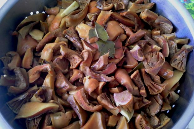 Βάζουμε όλα τα υλικά στην κατσαρόλα και, όταν αρχίσουν να βράζουν, ρίχνουμε και τα μανιτάρια. Βράζουμε σε μέτρια φωτιά για 15 λεπτά. Στραγγίζουμε και βάζουμε σε βάζα. Σκεπάζουμε με ελαιόλαδο. Σε 15 ημέρες είναι έτοιμο για κατανάλωση.