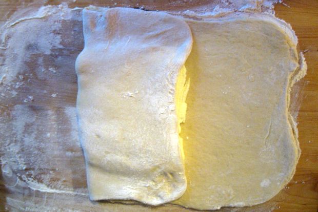 Βγάζετε τη ζύμη από το ψυγείο και επαναλαμβάνετε την προηγούμενη διαδικασία, χωρίς όμως να προσθέσετε άλλο βούτυρο: Ανοίγετε με τον πλάστη τη ζύμη και πάλι σε ένα παραλληλόγραμμο. Διπλώνετε τις δυο άκρες προς τη μέση και μετά ξαναδιπλώνετε τη ζύμη στη μέση, την τυλίγετε σε μεμβράνη και την βάζετε στο ψυγείο για μισή ώρα. Αυτή τη διαδικασία θα πρέπει να την επαναλάβετε τουλάχιστον 4 φορές συνολικά. Και κάθε φορά η ζύμη θα πρέπει να μπαίνει τυλιγμένη στο ψυγείο για να κρυώσει. Την τελευταία φορά θα αφήσετε τη ζύμη στο ψυγείο για 8 ώρες ή, ακόμη καλύτερα, όλη τη νύχτα.