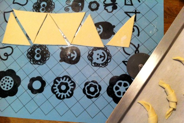 Την επόμενη μέρα θα ανοίξετε τη ζύμη σε χοντρούτσικο παραλληλόγραμμο φύλλο. Με ένα κοφτερό μαχαίρι θα κόψετε τις άκρες για να ισιώσετε το φύλλο σας. Κόψτε το φύλλο σε δυο οριζόντιες λωρίδες, αν θέλετε μεγάλα κρουασάν, ή τρεις αν τα προτιμάτε, όπως και εγώ, μικρότερα, και κόψτε την κάθε λωρίδα σε ισομεγέθη τρίγωνα.