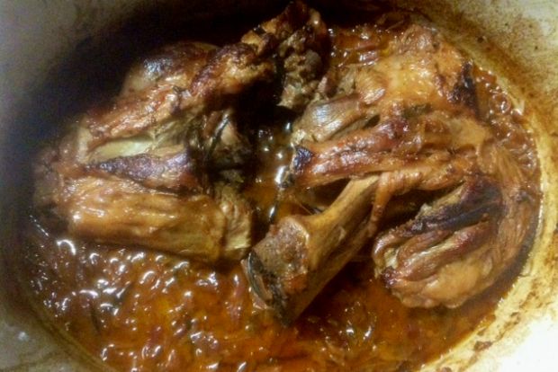Ψήστε σε προθερμασμένο φούρνο 200 βαθμών για 20 λεπτά και μετά χαμηλώστε τη θερμοκρασία στους 180 και ψήστε σύνολο 3 περίπου ώρες, ώσπου να πέφτει το κρέας απ τα κόκκαλα. Γυρίστε το κρέας μια φορά.