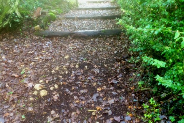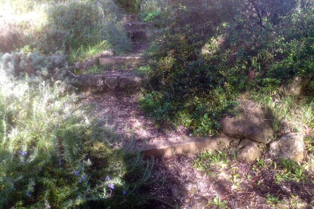 Στις φωτογραφίες θα δείτε τις πρόσφατες εργασίες σ’ ένα μονοπάτι που οδηγεί μέσα από τα πιο απομακρυσμένα σημεία του κτήματος. Το μεγάλο μου καμάρι είναι η πέτρινη σκάλα που χτίσαμε πέρσι τον χειμώνα και ήδη μοιάζει σα να ήταν πάντα εκεί.