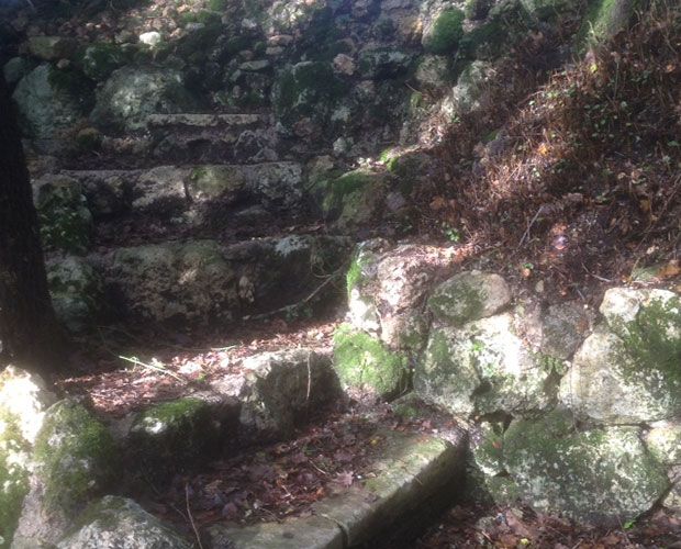 Αυτή την εποχή του χρόνου, που είναι λίγες οι γεωργικές και οι φυτοτεχνικές εργασίες κι έχει μαλακώσει το χώμα απ’ τις βροχές, ασχολούμαστε πολύ με τα μονοπάτια… συντηρώντας τα παλιά και χαράζοντας νέα σε περιοχές καθαρισμένες από λόγγο που γίνονται για πρώτη φορά προσβάσιμες, συμπληρώνοντας περιπάτους. Τα σκαλιά χρειάζονται πιο πολλή δουλειά, χρειάζονται σωστό χτίσιμο, με τις πέτρες από τις γκρεμισμένες ξερολιθιές που στήριζαν παλιά τις πεζούλες. Εκεί που η κλίση είναι μικρή γίνονται όμορφα σκαλιά, πλατειά και ρηχά, και με κορμούς πεσμένων δέντρων. Σκοπός μου πάντοτε είναι να μη μοιάζει τίποτα καινούργιο και τεχνητό, να εντάσσεται στο τοπίο. Το κλίμα της Κέρκυρας μας βοηθάει πολύ με την υγρασία που γρήγορα ντύνει με βρύα και σκουριές τις πέτρες και πράσινο χορταρένιο χνούδι το εγχαραγμένο χώμα.
